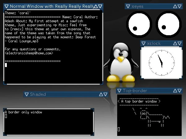 My first attempt at a sawfish theme. Just experimenting. Feel free to [remix] this theme at your own expense. The name of the theme was taken from the song that happened to be playing at the moment; Deep Forest - Coral Lounge.mp3