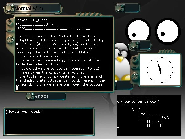 This is a clone of the 'Default' theme from Enlightnment 0.13 Basically is a copy of s13 by Dean Scott (drscott12 at hotmail dot com) with some modifications:
