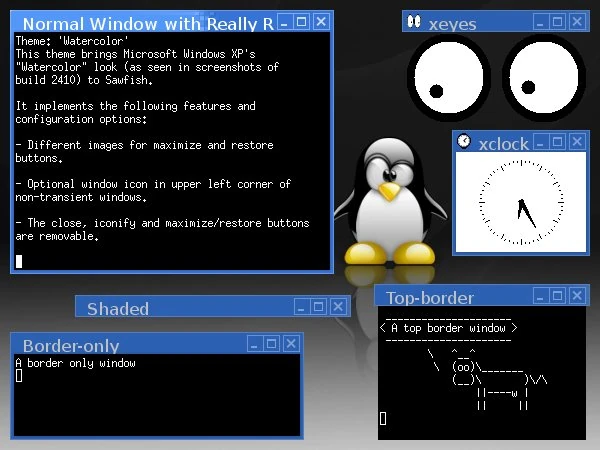 This theme brings Microsoft Windows XP's "Watercolor" look (as seen in screenshots of build 2410) to Sawfish.